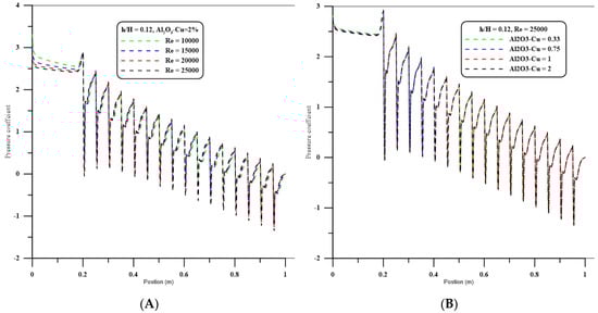 (A) Effect of Reynolds number on pressure coefficient for %2 hybrid nanofluids of Al2O3-CuO at h/H = 0.12 and P/W = 10. (B) Effect of volume fraction of hybrid nanofluids of Al2O3-CuO for Re = 25,000 at h/H = 0.12 and P/W = 10.