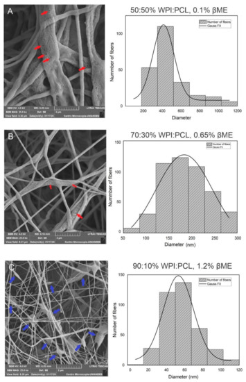 On the other hand, the diameter and presence of beads in the fibers were influenced by the concentration of βME in the spun solution. Note that the viscosity of the solution is modulated with the addition of βME owing to βME-induced unfolding of the globular proteins of WPI by the polypeptide chain entanglement and chain–chain interaction with the PCL. This enhanced the elasticity of the solution jet during the electrospinning process [28]. The same result was observed by Kabay et al. [55], who modified the viscosity of a BSA protein solution with the addition of βME and it was possible to spin the protein solution without the addition of a polymer, which would not have been possible with the protein alone.