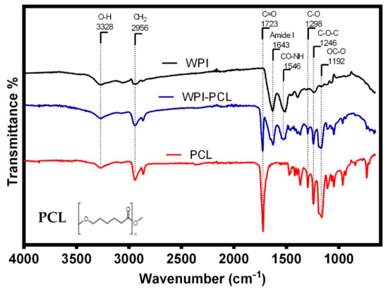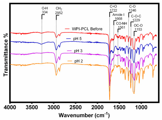 Furthermore, the results suggested the βME did not influence the chemical structure of the PCL and there was no appreciable difference between the spectra of WPI alone and the WPI in the electrospun fibers. Moreover, the used organic solvents did not have an effect on whey protein, similar to the study reported by Ahmed et al. [19].