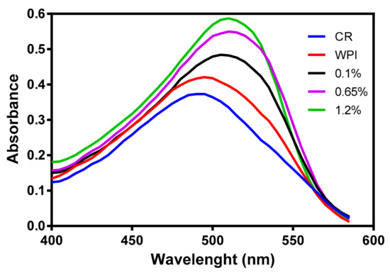 Congo Red (CR) assay was used to qualitatively identify amyloids and to determine the effect of the addition of βME on WPI that is a denaturant agent of proteins. CR is a specific dye that binds with the crossed-β-pleated sheet structure common to a variety of amyloid fibrils, thus causing an increase in the absorption from 490 nm and when bonded to a native protein to 510 nm when CR is bonded to amyloids [61]. CR analysis (see Figure 4) showed the absorption spectra of this dye alone and in solution with a WPI (14%) and presented a maximum absorption peak at 490 nm. The solution of WPI (14%) treated with different concentrations of βME showed an increase in the absorption band to 510 nm demonstrating the presence of amyloid structures in the solution. Moreover, there was an increment of the absorbance at 510 nm when the concentration of βME increased in the solution of WPI, which was due to an increase of the β-sheet content relative to the native state of the proteins [62].