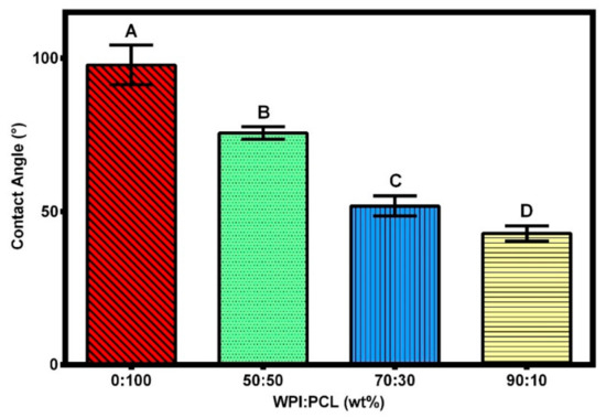 Contact angle of the hybrid membrane of PCL-WPI prepared with different compositions of WPI:PCL (wt%). Error bars are standard deviations (n = 3). Different letters indicate significant differences between different treatments at p-level = 0.05 based on the least significant difference (LSD) test.