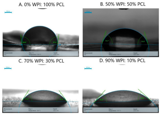 Pictures of the contact angle of the hybrid membrane of PCL-WPI prepared with different compositions of WPI:PCL (wt%).