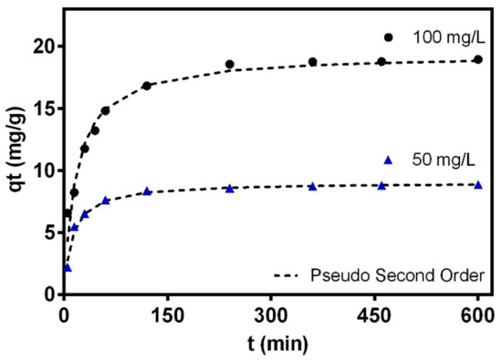 These experimental data were fitted using the kinetics classic models of pseudo-first, pseudo-second-order and Intra-particle diffusion. Note that the first-order kinetic model is commonly used to model the first adsorption step at the initial period and the second-order kinetic model is suitable to describe the whole adsorption process involving two stages for the pollutant removal where the first one was fast and reached the equilibrium quickly, the second was slower, and continued for a long contact time [71]. The intraparticle diffusion model involves three steps, which consist in a film diffusion, the intraparticle diffusion and the attachment of the adsorbate that occurs rapidly and it is not a rate limiting step. The pseudo-second-order model was the best to fit the experimental data with R2 > 0.97 with modeling errors lower than 9%, see Table 6. Thus, it can be concluded that the rate of the adsorption process relied on two adsorption processes where Cr(VI) ions were adsorbed on the surface of the membrane and also possibly reduced to Cr(III) [72]. Considering that pseudo-second order represented the adsorption process better on the hybrid membrane, this suggests that chemisorption may be the rate controlling mechanism [73]. Moreover, the low R2 value of the intraparticle diffusion model was evidence to conclude that the diffusion occurred relatively quickly from the solution, and Cr adsorption on the hybrid membrane of WPI-PCL did not follow this model. Therefore, it could be expected that the adsorption may be an external surface process in the absence of internal diffusion [74].