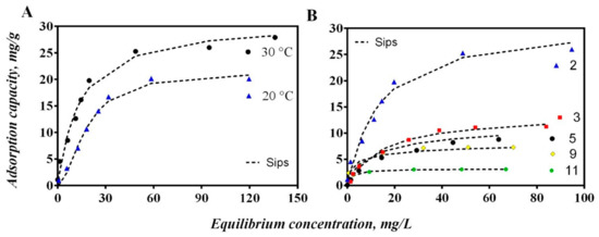 Isotherms for chromium adsorption from aqueous solutions using an adsorptive membrane of WPI-PCL. (A) Effect of temperature at pH 2 and (B) effect of pH at 30 °C.