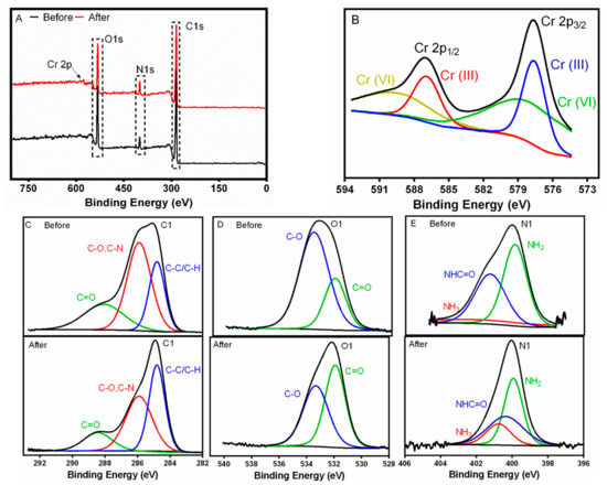 - Yuan, Z.; Cheng, X.; Zhong, L.; Wu, R.; Zheng, Y. Preparation, Characterization and Performance of an Electrospun Carbon Nanofiber Mat Applied in Hexavalent Chromium Removal from Aqueous Solution. J. Environ. Sci. 2019, 77, 75–84. [Google Scholar] [CrossRef]