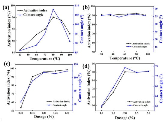 It can be seen from Figure 1 that when other conditions remained unchanged, the activation index and contact angle of the zeolite modified product did not change much with rise in the modification temperature. Therefore, 20 °C was selected as the optimal modification temperature condition, and the activation index was 90.76% and the contact angle was 77.00°. The activation index and contact angle of zeolite modified products increased first and then tended to be unchanged with increase of dosage of dodecyl tertiary amine. When the dosage of the medicament was 1.0%, the activation index was 64.85%, the contact angle was 60.00°, and when the dosage of the medicament was between 1.0~2.0%, the activation index and contact angle increased with the addition of dosage. When the dosage of the agent reached 2.0%, the activation index was 90.20%, the contact angle was 75.50°. Then, the activation index and contact angle became stable when the dosage continued increasing. Therefore, the optimal dosage was 2.0%.
