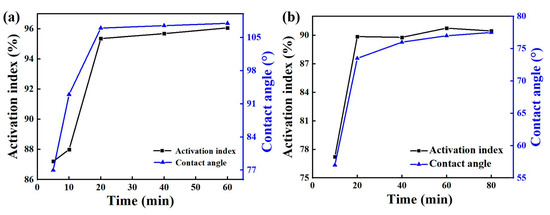 The contact angle-activation index analysis of the two chemicals in Figure 2 shows that when other conditions remained unchanged, the activation index and contact angle modification time of the modified zeolite product first increased and then tended to remain unchanged. When the modification time was 5 min, the activation index was 87.21%, and the contact was 77.00°. For modification times between 5 min and 20 min, the activation index and contact angle increased with the modification time. When the modification time reached 20 min, the activation index was 95.36%, and the contact angle was 107.00°. With the increase of modification time, the activation index and contact angle tended to be stable. So, the optimal modification time of Octadecylamine was 20 min. When the modification time of Dodecyl tertiary amine was 10 min, the activation index was 77.23% and the contact was 57.00°. When the modification time was between 10 min and 20 min, the activation index and contact angle increased with the modification time. When it reached 20 min, the activation index was 89.87%, and the contact angle was 73.50°. With further increase of the modification time, the activation index and contact angle tended to be stable. Therefore, the optimal modification time of twelve tertiary amine was 20 min.
