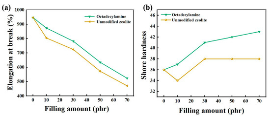 The effect of filling amount on elongation at break (a) and Shore hardness (b).