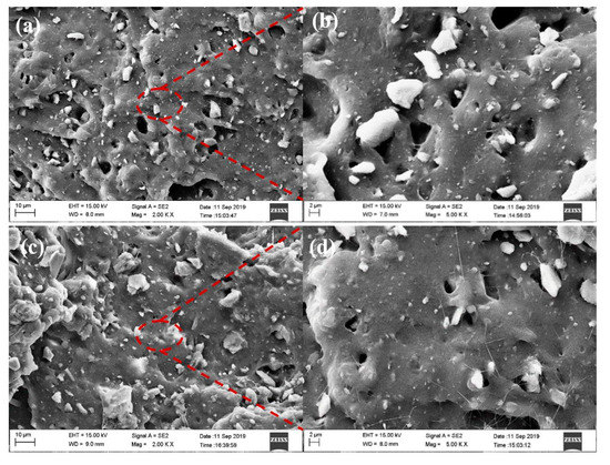 It can be seen from Figure 7a,b that there are many black cavities in the tear section of the unmodified zeolite/natural rubber. This was caused by the zeolite particles being pulled out of the rubber matrix during the tearing and fracture processes, indicating that the interfacial bonding between unmodified zeolite and natural rubber was poor. Therefore, it could be seen that its mechanical properties were poor. From Figure 7c,d, it can be seen that the Octadecylamine-modified zeolite/natural rubber had fewer black cavities in the tearing section, the filler particles were more uniformly distributed, and the interface between the zeolite particles and the rubber matrix was blurred, and there seemed to be a layer of rubber matrix. It indicated that the zeolite modified by Octadecylamine could act well with the rubber, and the composite rubber could withstand greater external force when subjected to tearing strain [14,15], and its mechanical properties would be better.