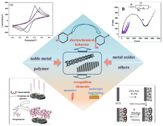Molecularly imprinted polymers (MIPs) are composites of functional monomers, crosslinkers, and template molecules that can withstand a more comprehensive pH and temperature range than biomaterials. Therefore, MIPs have been widely used in the preparation of electrochemical sensors for the detection of antibiotics [40,82,83]. CNTs have been studied more extensively as carriers of MIPs. The scheme of acrylamide functionalized MWCNTs used to synthesize molecularly imprinted polymers to detect kanamycin was reported by Benzhi Liu et al. for the first time [84]. The results show that the detection range is 4 to 50 μM and the LOD is 0.68 μM. Moreover, the sensor has a good recovery rate of about 94.0–95.3% in milk and milk powder. Bimetallic particles are also used to increase their pore size to enhance the response signal. A new electrochemical sensor was composed of MWCNTs-MIP, SWCNTs, and dendritic platinum and palladium nanoparticles [85]. The ion exchange strategy was used for the first time to branch ionic liquids onto the surface of MWCNTs to prepare MIP. The function of MWCNTs is to increase the specific surface area of the electrode and increase the electrocatalytic activity of amoxicillin. The results show that the sensor obtained under the optimal conditions has a linear response to amoxicillin with a low LOD of 8.9 nM, in the range of 1.0–1000 nM. The prepared electrode was successfully applied to the determination of amoxicillin, with the recovery in honey and milk samples showing a practical prospect in real samples.