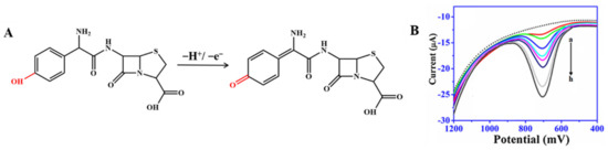 (A) Mechanism for the electrochemical oxidation of amoxicillin; (B) Square-wave voltammograms recorded for amoxicillin of different concentrations using AuNP-PdNP-ErGO/GCE. Reprinted with permission from. Adapted with permission from Ref. [42]. Copyright 2017 Elsevier.