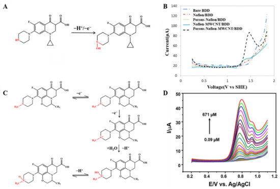 Mechanism for the electrochemical levoxidation of ciprofloxacin (A) and ofloxacin (C). (B) DPV curves of 50 µM ciprofloxacin on BDD, Nafion/BDD, porous-Nafion/BDD, Nafion-MWCNT/BDD, and porous-Nafion-MWCNT/BDD electrodes in 0.1 M KH2PO4 solution (pH = 4.50). Adapted with permission from Ref. [67]. Copyright 2016 ACS. (D) DPV response was obtained for Ag/AgVO3/N-rGO/SPCE by linear addition of levofloxacin in the N2 environment. Adapted with permission from Ref. [74]. Copyright 2021 ACS.