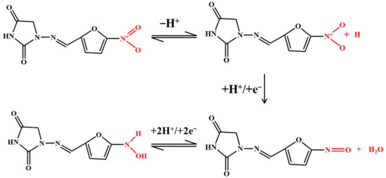 Nitrofuran antibiotics are synthetic broad-spectrum antibiotics with 5-nitrofuran as their basic structure. The electrochemical activity of furan is related to its irreversible reduction of the nitro (–NO2) to nitroso intermediate, which is rapidly reduced to the corresponding hydroxylamine group (–NHOH), as shown in Figure 6 [48,69,75]. Kuo-Yuan Hwa and Tata Sanjay Kanna Sharma reported using a NiFe/MWCNTs hybrid composite as an electrocatalyst to detect nitrofurantoin. The composite has a high surface area and high electron transport, which reduces the charge-transfer resistance. The results show that the composite has good conductivity and excellent electrocatalytic activity. The LOD is 0.03 μM and the sensitivity is 11.45 μA μM−1cm−2. The NiFe2O4/rGO nanocomposites were prepared using a hydrothermal method. The high specific surface area and better electrical conductivity of graphene help to improve the signal. In addition, graphene as a carrier modified by NiFe2O4 nanoparticles can prevent any aggregation of these particles [75]. The electrochemical sensor has a linear correlation with the concentration of furazolidone in the linear range of 0.1–10.0 μM and 10.0–150.0 μM, and the LOD is 0.05 μM.