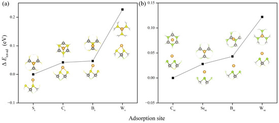 The recent emergence of Janus two-dimensional (2D) transition metal dichalcogenides (TMDs), which refer to layers with different surfaces (e.g., MoSSe and WSSe), have piqued intense research interest due to their distinctive characteristics and potential energy conversion applications [9,10,11,12]. The intrinsic dipole in Janus 2D materials induced by the out-of-plane asymmetric structure could strengthen the adsorption of molecules or atoms on the surface [13], which might result in a better production environment for SACs [14]. Transition-metal adatoms, in turn, could efficiently adjust the Janus TMDs’ dipole moments [15]. It has been claimed that, by increasing the inherent dipole, the adsorption of appropriate transition-metal adatoms can cause the interactions between H2O and MoSSe to transform from weak electrostatic van der Waals (vdW) to powerful chemical bonding, considerably enhancing the adsorption of H2O molecules and laying the groundwork for photocatalytic water-splitting processes [14].
