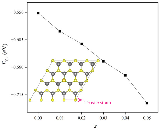 To further enhance the stability of Au/WSSe, we applied uniaxial tensile strain to it, which is widely used to tune the morphologic and electric structures of two dimensional materials [10,12,36,37]. As displayed in Figure 2, the calculated results stated that the Efor became lower with higher tensile strain. Moreover, as shown in Figure 3a, the single Au atom came closer to the surface of the WSSe monolayer as the tensile strain rose, which could be verified by the lower height (h) of the single Au atom from the W plane (see Figure 3b). Furthermore, based on the calculated results obtained with the climbing image nudged elastic band (CI-NEB) method (see Figure S4), we found that the extra tensile strain could make the diffusion barriers of single Au atom increase (from 2.75 eV at free state to 3.10 eV under 5% tensile strain), which also revealed that introducing uniaxial tensile strain could increase the stability of Au/WSSe.
