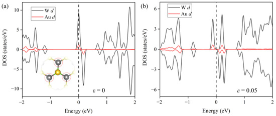 Partial density of states (PDOS) of the d orbitals of the single Au atom and its three nearest neighboring W atoms (circled with the red lines shown in the inset) in Au/WSSe (a) without and (b) with external tensile strain (ε = 5%).