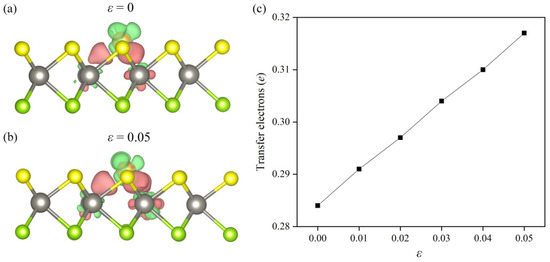 The 3D differential charge density plots of Au/WSSe (a) without and (b) with external tensile strain. The green and pink regions stand for electron depletion and accumulation, where the isosurfaces are set to 0.004 e/Å3. (c) The charge gained by the single Au atom in Au/WSSe under different tensile strain.