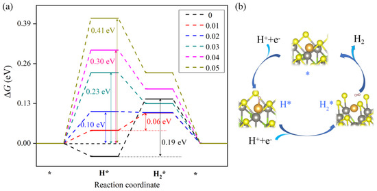 Due to the high hydrogen adsorption free energy () [43], the pristine Janus WSSe monolayer is inert to the electric-catalytic HER, which is similar to other layered transition metal dichalcogenides [44,45]. Nevertheless, for the Au/WSSe, as shown in Figure 6a, the ΔGH* dropped down to −0.042 eV, due to the high activity of the single Au atom. Unfortunately, the second hydrogenation step (H* → H2*, see Figure 6b) proceeded a bit laboriously (), because of the over-powerful binding strength of the intermediate H*. Many previous works reported that the electric-catalytic performance of SAC was sensitive to the electron distribution of the single metal atom [1,3,4]. In addition, as stated earlier, the gained electron of the single Au atom in Au/WSSe could be adjusted by the extra tensile strain. Hereby, we calculated the on Au/WSSe under different additional tensile strain. As shown in Figure 6a, the rises as the extra tensile strain becomes heavier.