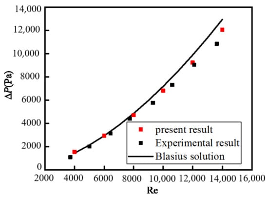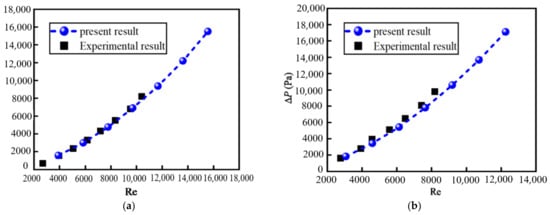 Figure 4 shows the relationship between the pressure drop ∆P and Reynolds number Re with different volume fractions φ of nanoparticles. The present numerical results are in good agreement with the experimental results []. The pressure decreases along the flow direction due to the energy loss when nanofluid flows through the tube. This energy loss is caused by overcoming the internal friction and the collision and momentum exchange between the fluid particles in the turbulent flow. The values of ∆P increase with the increase in Re. The higher the Re is, the more intense the collision and momentum exchange between the fluid particles is, the greater the energy loss is, so the larger ∆P is.