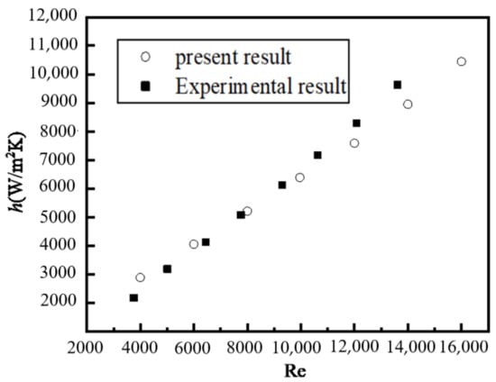 The values of h and Nu increase nearly linearly when Re changes from 3000 to 16,000. The relationship between h, Nu, and Re is consistent with previous conclusions [,,]. The fact that the values of h and Nu are proportional to Re is attributed to the three factors: (1) the disordered movement of particles caused by the turbulent flow is more obvious at high Re, improving the heat transfer; (2) the laminar sublayer near the wall is thinner and the shear stress subsequently increases at high Re; and (3) a greater amount of heat is carried by a faster moving fluid at high Re than a slower moving fluid at low Re.