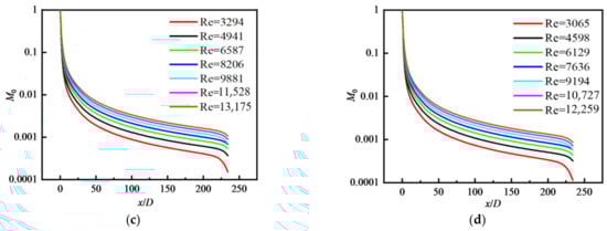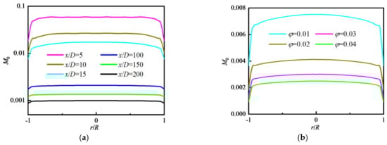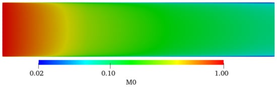 The distribution of particle number concentration is determined using particle convection, diffusion, and coagulation. Particle convection and diffusion do not change the total particle number, but particle coagulation reduces the total particle number. The characteristic time of coagulation is very short. As shown in Equation (23), the zero-order moment M0 represents the particle number concentration. The distribution of M0 in the region of 0 ≤ x ≤ 5D is shown in Figure 6 where a significant reduction in M0 was observed because of particle coagulation. The value of M0 near the wall of the tube decreased to the original 2%, and it also decreased by about 90% in the central area of the tube.