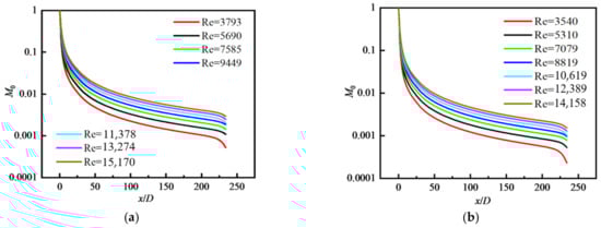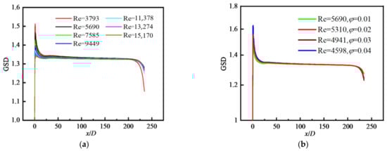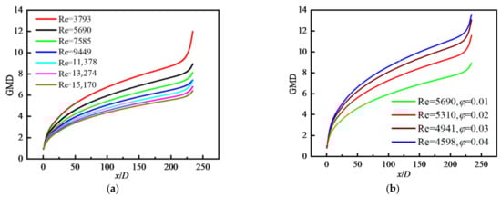 - M0 decreases along the flow direction. M0 near the wall is decreased to the original 2% and decreased by about 90% in the central area. For a fixed φ, with the increase in Re, M0 increases and the reduction rate of M0 along the flow direction decreases. M0 decreases with increasing φ and is the largest in the inlet area, and gradually decreases along the flow direction. M0 in the core area basically presents a uniform distribution. GMD increases with increasing φ, but with decreasing Re because the larger the Re is, the smaller the possibility of particle collision and coagulation is. GMD is the minimum in the inlet area and gradually increases along the flow direction, and basically presents a uniform distribution in the core area. GSD increases sharply at the inlet and decreases in the inlet area, and then remains almost unchanged in the whole tube, finally decreasing rapidly again at the outlet. The effects of Re and φ on the variation in GSD along the flow direction are insignificant. In the inlet area, GSD decreases along the flow direction, and is unevenly distributed and fluctuated along the radial direction. Downstream, GSD changes little along the flow direction and presents a uniform distribution along the radial direction. φ has little effect on GSD except for the case of φ = 0.01.