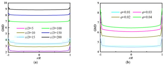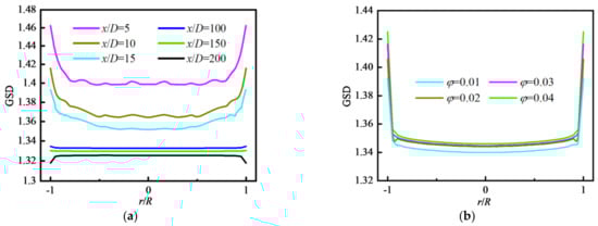Here, we analyze the particle distribution at different φ considering particle coagulation. At the inlet, the nanoparticles are single-mode monodisperse (monomers of the same size, and the initial particle diameter is the same), and the the particle diameters meet the logarithmic normal distribution at the outlet after particle coagulation []. The geometric mean diameter of the particle (GMD) and the geometric standard deviation of the diameter (GSD) are expressed as: