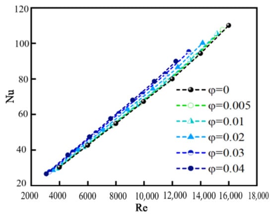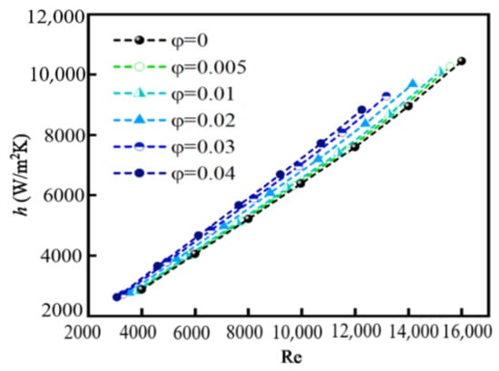 - h and Nu are larger for nanofluids than that for pure water, and increase with the increase in φ. However, the variation in φ from 0.005 to 0.04 has little effect on h and Nu because of particle coagulation. The values of h and Nu increase nearly linearly when Re changes from 3000 to 16,000 because the disordered movement of particles caused by the turbulent flow is more obvious at high Re, and a greater amount of heat is carried by a faster moving fluid at high Re than a slower moving fluid at low Re.