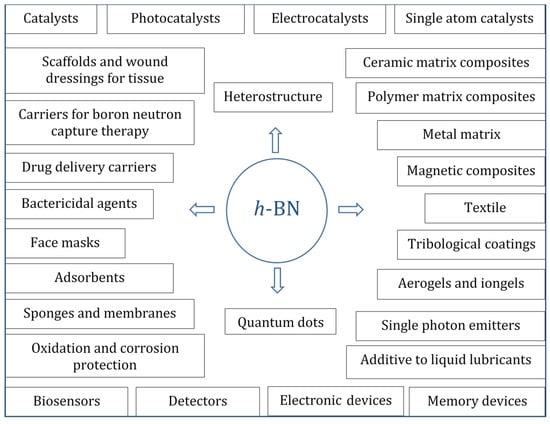 Due to its unique physical, chemical, and mechanical properties, such as a low specific density, large specific surface area, excellent thermal stability, oxidation resistance, low friction, good dispersion stability, enhanced adsorbing capacity, large interlayer shear force, and wide bandgap, hexagonal boron nitride (h-BN) nanostructures are of great interest in many fields. These include, but are not limited to, (i) heterogeneous catalysts, (ii) promising nanocarriers for targeted drug delivery to tumor cells and nanoparticles containing therapeutic agents to fight bacterial and fungal infections, (iii) reinforcing phases in metal, ceramics, and polymer matrix composites, (iv) additives to liquid lubricants, (v) substrates for surface enhanced Raman spectroscopy, (vi) agents for boron neutron capture therapy, (vii) water purifiers, (viii) gas and biological sensors, and (ix) quantum dots, single photon emitters, and heterostructures for electronic, plasmonic, optical, optoelectronic, semiconductor, and magnetic devices. All of these areas are developing rapidly. Thus, the goal of this review is to analyze the critical mass of knowledge and the current state-of-the-art in the field of BN-based nanomaterial fabrication and application based on their amazing properties.