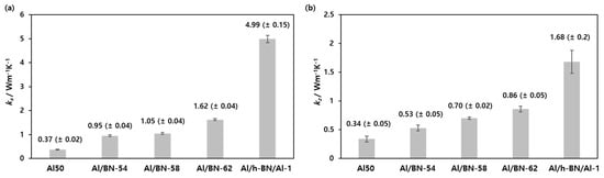 | Composites | Silicone Resin (g) | Al2O3 Mixture (g) | h-BN Mixture (g) | Filler Content (wt.%) |