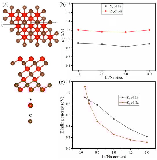 To conduct the current DFT investigations, we employed VASP software (Vienna, Austria) known as the Vienna Ab Initio Simulation Package [], whereas correlation potential and the electronic exchange were examined by utilizing a generalized gradient (GGA) combined with a Perdew–Burke–Ernzerhof (PBE) functional (GGA-PBE). This is because the GGA-PBE is a nonempirical functional with judicious accuracy for qualitative and quantitative prediction of the molecules interacting and being stored with metal surfaces over a wide range of systems []. In the present calculations, we restricted the force value to 1/100 eV/Å, and the energy was 1 × 10−6 eV. Based on the GGA-PBE level, we simulated the electronic structure of V4C3 and Li/Na loaded V4C3. For plane-wave expansion, cut-off energy of 500 eV was selected. The Monkhorst–Pack technique was employed to sample the k-points in the Brillouin zone, with a dense k-point grid of 17 × 17 × 1 []. Additionally, the DFT-D2 model [] was applied in our calculations to acquire reliable binding strength between Li/Na and V4C3. In the structure of V4C3, we generated a vacuum space of 20 Å to prevent coupling between V4C3 layers.