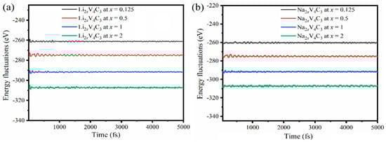 The energy fluctuation reduced with increasing Li/Na loading in both Li2xV4C3 and Na2xV4C3. However, the energy remained stable without any significant change over time, as illustrated in the straight line (Figure 3). That serves as an indication of the insignificant change in the structures of Li2xV4C3 and Na2xV4C3 without any deformations during Li/Na intercalation on the time scale of 1 fs to 5000 fs, which is in line with other reports on 2D materials [,,]. We executed our simulations up to 5 ps (5000 fs) at 300 K. These steps are enough as the structure is retained at the end of 5 ps. It is noticed that the total energy converges right after as the time duration increases. Furthermore, our results show a low energy fluctuation.