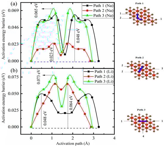 Activation pathways with their corresponding energy barriers of Na (a) and Li (b). The numbers (1-2-1, 2-3-2, and 1-4-1) represent the energy paths for the migration of Li/Na content (x = 0.0625).