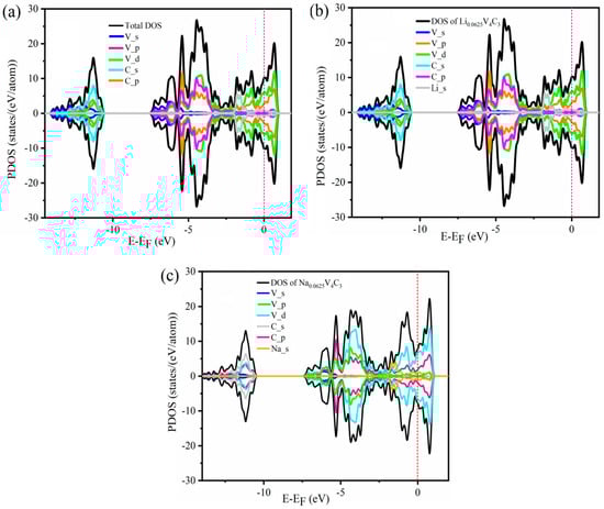Density of states of (a) bare V4C3, (b) Li0.0625V4C3, and (c) Na0.0625V4C3.
