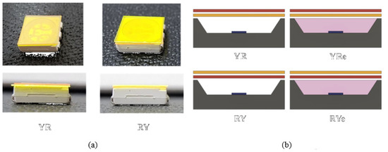 The four vertically-stacked W-LED structures: (a) Experimental W-LEDs of YR and RY structures and (b) their schematic cross-sectional drawings, including the YRe and RYe structures.