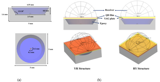 Another issue of W-LEDs is the long-term stability of color-conversion materials. which are affected by the high thermal load caused by hot LED chips. High temperature increases the probability of nonradiative transitions in phosphors and QDs, resulting in lower luminous efficiency and a shorter lifetime of W-LEDs [17,18,19]. In addition, the transparent epoxy resin, in which color-conversion materials are dispersed homogeneously, may degrade when it is exposed to high temperatures for a long time. Several remote designs of phosphors have been adopted to solve this problem, where the remote phosphor is placed over the blue LED chips with a certain distance between them [20,21,22,23,24,25]. QD can also be designed as a remote component to avoid degradation [26,27,28,29,30,31,32,33]. For example, QD particles were incorporated in polymers or glasses as composites in various forms [34,35,36,37,38,39,40,41,42,43,44,45,46,47]. In addition, large-size QD films or QD caps could be developed for practical applications in displays and illumination [48,49,50]. These designs could improve the efficiency, color-rendering characteristics, and long-term stability of W-LEDs successfully. However, a more detailed investigation is necessary for the optimization of W-LEDs consisting of at least two color-conversion materials adopted in a remote design. Especially, the order of the color-conversion materials and their positions in W-LEDs need to be investigated in terms of experiment and simulation from the viewpoint of key lighting performances. The present study is aimed at optimizing vertically-layered W-LEDs where two remote components, a yellow phosphor plate and a red QD film, were placed over blue LED chips with or without transparent epoxy resin. Especially, the effect of the remote configuration on the color-rendering characteristic was studied in detail. In addition, a high-power downlighting W-LED luminaire in a remote design was also studied by ray-tracing simulation based on the above optimization.