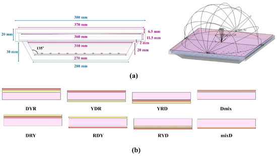 Simulation models of the high-power lighting fixture: (a) simulation model of the lighting fixture and (b) eight configurations from different stacking of the yellow phosphor film (Y), the red QD film (R), and the diffuser plate (D). “Mix” indicates the film in which both phosphor and QD particles are incorporated together.