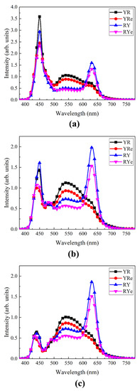 The emitting spectra of W-LEDs for the four configurations at the phosphor thickness of (a) 0.1 mm, (b) 0.15 mm, and (c) 0.2 mm.