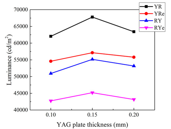 The dependence of the luminance on the thickness of the phosphor plate for the four configurations of W-LEDs.