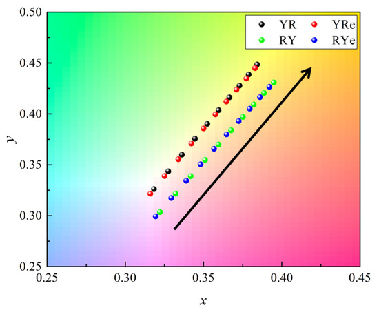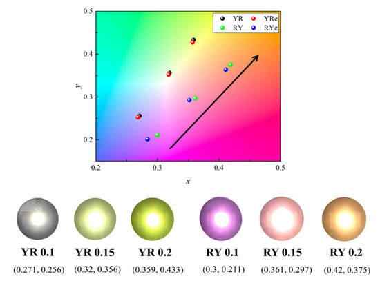 Figure 8 shows the change in the color coordinates of the four configurations as the phosphor thickness increases from 0.12 to 0.21 mm in the simulation model. The overall behaviors are similar to the experimental results shown in Figure 6. The color coordinates can be grouped into either YR/YRe or RY/RYe configurations and shift to the yellow region as the phosphor thickness increases. The order of the two vertically stacked color-conversion materials is important in the color characteristics.
