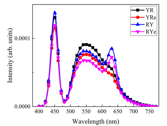 Four designs of the vertically-stacked structure were studied experimentally as shown in Figure 1. The “YR” structure indicates that the yellow phosphor is placed below the red QD film, whereas the “RY” structure shows the reversed case, i.e., the red QD film is put below the yellow phosphor plate. In these cases, no epoxy resin fills the space between the blue LED chips and the two remote color-conversion components. If this space is filled with transparent photopolymer, the two structures will be denoted as “YRe” and “RYe”, where “e” denotes epoxy. Transparent epoxy is usually formed over LED chips to protect them for long-term operation. A typical photopolymer (NOA63, Norland Co., Jamesburg, NJ, USA) was used as an epoxy, which was hardened by using the ultraviolet lamp (S30365FL, Skycares Co., Gimpo, Korea) for 20 min. Photometric quantities (luminous efficiency, intensity, luminance, etc.), the color coordinates, the emitting spectrum, and the CRI were measured by using a goniophotometer (LED626, Everfine Co., Hangzhou, China), a spectroradiometer (PR-670, Photo Research Co., Chatsworth, CA, USA), and an illuminance meter (SPIC-200A, Everfine Co., Hangzhou, China).
