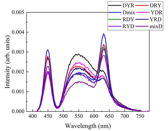 The simulation results for the vertically-stacked W-LED models shown in Figure 7 and Figure 8 are consistent with those obtained from the experiment, suggesting that the present simulation model is reliable for further studies. In this context, it is desirable to study high-power downlighting structures consisting of two remote-type color-conversion films by optical simulation. It is important to adopt high-power LED lighting in museums, exhibition halls, and industrial fields where high color-rendering performances are required. All configurations shown in Figure 3 were studied by optical simulation. Figure 9 shows the emitting spectra of all configurations. The red peak near 630 nm becomes more pronounced for the configurations where the red QD film is below the yellow phosphor film or the mixed film is adopted on the diffuser plate. On the other hand, the broad yellow peak is more substantial for the configurations where the yellow phosphor film is located below the red QD film. This is very similar to the results obtained from the small-size, vertically-stacked W-LEDs studied through both experiment and simulation.
