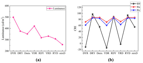 Figure 10a,b show the dependence of the luminance and the CRI on the film configuration, respectively. The luminance is the highest for the DYR configuration whereas it is the lowest for the mixD configuration. In the case of the DYR configuration, the blue light, homogeneously mixed via the diffuser plate, excites the yellow phosphor and the red QD films sequentially. Thus, the yellow peak, which is the most sensitive to the human eyes, is the strongest and the efficiency becomes the highest. On the other hand, the mixD configuration has the diffuser plate on top of the mixed color conversion film. The efficiency of this configuration is generally low due to the low transmission of the diffuser plate. Figure 10b clearly shows that the color-rendering property is closely related to the film configurations. Especially, the individual CRI ‘R9’ (deep red) becomes very low when the red QD film is on top of the yellow phosphor film. The red peak from the QD film in this configuration is generally very low due to insufficient excitation as Figure 9 shows, resulting in low R9 and, thus, Ra and Re. It should be noted from Figure 10b that the highest Ra is still slightly lower than 90 in all cases, which is due to the sharp dip between the blue peak and the yellow peak. This can be improved by adjusting the emitting spectrum of the yellow phosphor as has been experimentally demonstrated and shown in Figure 4. In this case, the CRI value of this high-power LED device is expected to be higher than 90, similar to the experimental results.