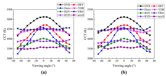 Figure 11a,b show the angular distribution of CCT along the vertical and horizontal directions, respectively. The viewing angle is defined by the angle between the normal direction and the viewing direction, which was changed along the horizontal and vertical directions at a regular interval. It indicates that, in the spherical coordinates, the polar angle is defined as the viewing angle at two fixed azimuthal angle, i.e., 0 and 90° on the emitting surface. Two groups can be recognized from the data sets, one with negligible angular dispersion (YRD, YDR, RYD, and mixD; these configurations will be denoted as Group-I) and the other with substantial angular dispersion (DYR, DRY, Dmix, and RDY; these configurations will be denoted as Group-II). The configurations in Group-I have a common characteristic that the diffuser plate is on top of other color-conversion films except for the YDR configuration. The diffuser plate scatters and mixes the light strongly making the distribution on it Lambertian. Due to the strong diffusing function, color properties look the same irrespective of the viewing angle. In the case of the YDR configuration, the light passing through the top red QD film experiences different optical path lengths causing higher color-conversion probabilities along the higher viewing angles. However, the QD film is very thin, thus the color dispersion caused by the path length difference may be rather small compared to the thick phosphor plate. This is indeed observed from the data shown in Figure 11 where the CCT of the YDR configuration slightly decreases as the viewing angle increases due to the enhanced red component via longer path length in the QD film. On the other hand, all configurations in Group-II show significant color dispersion, i.e., substantially lower CCT values at higher viewing angles. This is mainly due to the large difference in the optical path length in the color-conversion films for the excitation light. As the two films are put over the diffuser plate except for the RDY case, the effect of the path length difference is expected to be pronounced for the light escaping the lighting fixture. In the case of RDY configuration, the color dispersion occurs mainly by the yellow phosphor film, which is thick enough to have a more substantial effect on the angular CCT dispersion compared to the YDR configuration. Finally, we need to remark on some asymmetric behaviors shown in Figure 11. The origin of the slight asymmetry may be most probably due to the insufficient number of rays used in the simulation. Otherwise, two sets of data along both horizontal and vertical directions should have been nearly the same. However, important conclusions derived from the simulation and the resulting design rules described below are not affected by the slight asymmetric behaviors.