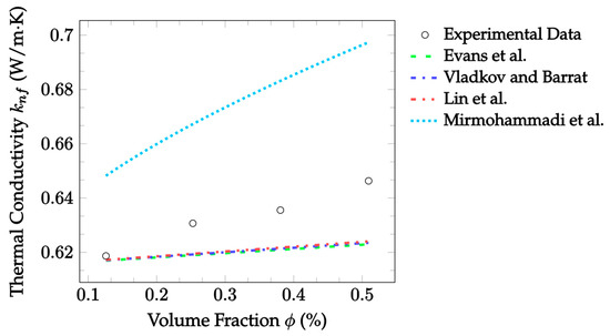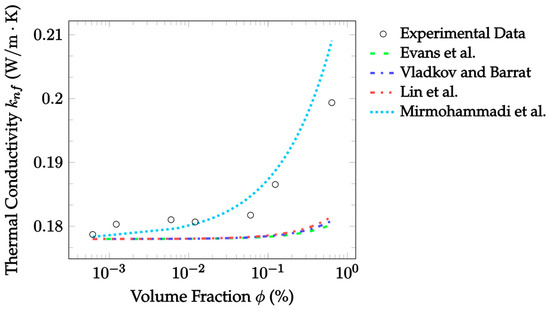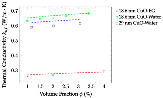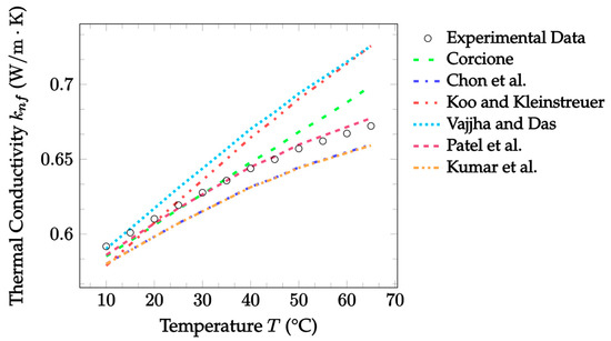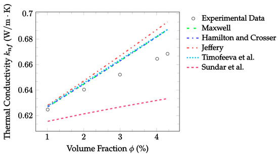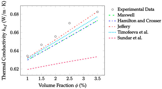 Figure 2 also demonstrates the accuracy of EMT model predictions against the experimental data, now for CuO–water nanofluid. This data was gathered at a room temperature of 300 K, but volume fractions ranged from 1.0–3.5%. In this case, Jeffery [16] best predicted the thermal conductivity, with an MAE of 0.547%, followed by Timofeeva et al. [17] with an MAE of 0.941% for the given experimental data. In this case, all models examined underestimated the thermal conductivity at most volume fractions, with only the Jeffery [16] model reaching the experimental thermal conductivity at a volume fraction of 3.5%. Again, the Sundar et al. [18] model underestimated more severely at all temperatures, but the data examined here was again for a different particle material than that which the model was based on.