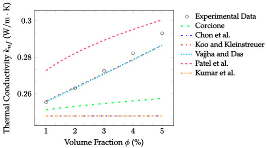 Furthermore, Patel et al. [23] experimented with Al2O3, CuO, Cu, and Al nanofluids using water, ethylene glycol, and transformer oil as base fluids. The parameters varied included the volume fraction, particle diameter, and temperature. Non-linear regression analysis was performed on the obtained data, and the resulting Patel et al. [23] model is given in Equation (18):