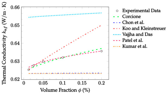 The advantage of this model is its simplicity. The knowledge of the particle’s thermal conductivity is not a requirement, unlike the Maxwell [14], Hamilton and Crosser [15], and Jeffery [16] models. Although, this advantage comes with a drawback. As the particle’s thermal conductivity approaches the base fluid’s thermal conductivity, the accuracy of the Timofeeva et al. [17] model is expected to decrease. Typically, the particle’s thermal conductivity is significantly greater than that of the base fluid, so in most cases, this would not be an issue.