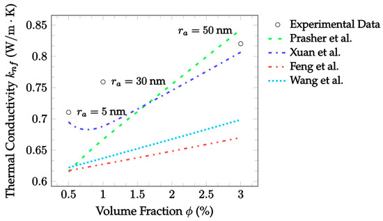 where is the thermal conductivity of the nanolayer, is the nanolayer’s thickness, and is the nanoparticle radius. The Leong et al. [25] model does not use empirical constants, so there are no validity range issues. This gives it an advantage over all the Brownian models discussed. It utilizes the same assumptions as Maxwell [14], assuming spherical, non-interacting particles. However, it additionally considers the particle size, giving it an advantage over all the EMT models discussed. Nonetheless, the model is significantly more complex than the EMT or Brownian models analyzed. This is due to the use of the nanolayer properties, which are not well known in the literature. This would make it more difficult to apply in many scenarios.
