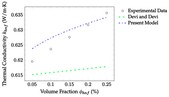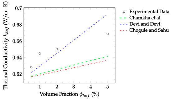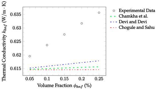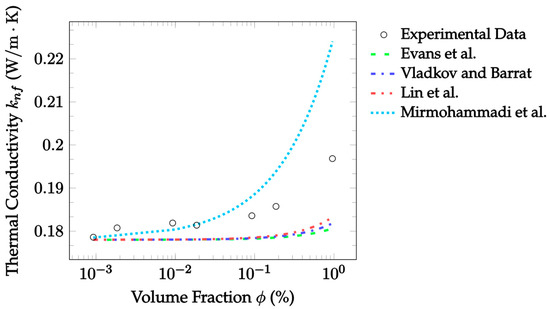 where denotes the thermal conductivity, with subscripts , , and denoting the nanofluid mixture, base fluid, and nanoparticles, respectively, and denotes the volume fraction of the solid nanoparticles. The advantage of this model is its simplicity. However, it does not account for the particle size or shape, which is a disadvantage. Additionally, the model assumes that the nanoparticles are well separated and non-interacting. Consequently, the model’s accuracy is expected to decrease with increasing concentrations.