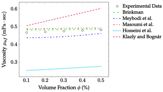 Similarly to thermal conductivity enhancement, there are several mechanisms by which the introduction of nanoparticles is thought to influence the viscosity of nanofluids. Some of the models investigated consider the Brownian motion of the nanoparticles, as well as the nanolayer and EMT. However, other commonly considered mechanisms include kinetic gas theory, local composition, and binary mixing [57]. The effects of nanoparticles on nanofluid viscosity are somewhat disagreed upon depending on the characteristic investigated. However, Mishra et al. [58] found that an increase in nanofluid viscosity with an increasing particle concentration is widely reported in the literature. An even stronger agreement was observed with the effects of temperature. It is clear from many existing studies that an increase in temperature decreases the viscosity of the nanofluid [58]. Brinkman [48] created an early nanofluid viscosity model, where it was suggested that the nanofluid viscosity is solely dependent on the nanoparticle volume concentration and the base fluid viscosity. Meybodi et al. [49] proposed a more complex model, additionally considering the effects of concentration and temperature. They also accounted for particle size, where it was predicted that as the nanoparticle diameter increases, the nanofluid viscosity increases. Masoumi et al. [50] developed their model to consider the effects of Brownian motion on the nanofluid viscosity. Nanoparticle size and density, volume fraction, and temperature were all accounted for. A correction factor, found by analyzing experimental data was also taken advantage of. Hosseini et al. [51] proposed an empirical model based on dimensionless groups considering the temperature, nanoparticle size, volume fraction, base liquid viscosity, and the nanolayer. Yet another model was created by Klazly and Bognár [52] that considered nanofluid viscosity to be a function of nanoparticle size and material, base fluid properties, temperature, particle density, and the nanolayer thickness.